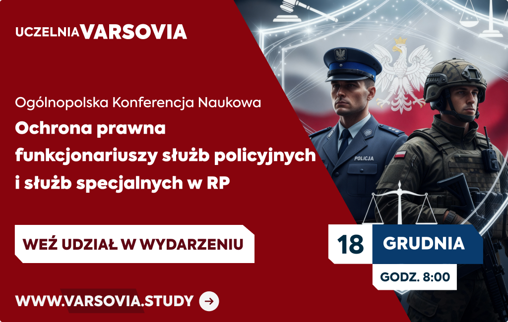 Uczelnia Biznesu i Nauk Stosowanych Varsovia zaprasza na Ogólnopolską Konferencję Naukową „Ochrona prawna funkcjonariuszy służb policyjnych i służb specjalnych w RP”. Data: 18 grudnia 2025 r., godz. 8:00–18:00Lokalizacja: Uczelnia Biznesu i Nauk Stosowanych Varsovia,Al. Jerozolimskie 133A, WarszawaForma: Stacjonarnie i online – wybierz, jak chcesz uczestniczyć! Wydarzenie poświęcona będzie jednej z kluczowych kwestii współczesnego systemu bezpieczeństwa […]